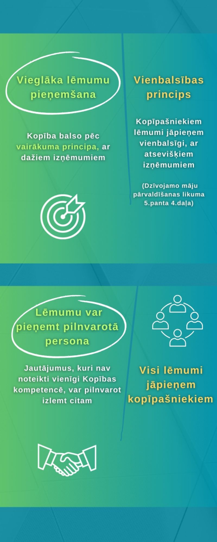 Īpašuma tiesība uz dzīvokļa īpašumu dzīvokļa īpašniekam rada ne vien pilnīgas varas tiesību uz to, bet arī uzliek noteiktus pienākumus. Viens no šādiem dzīvokļa īpašnieka un pienākumiem ir Dzīvojamo māju pārvaldīšanas likuma 5.panta pirmajā daļā noteiktais pienākums nodrošināt dzīvojamās mājas pārvaldīšanu, kas ietver arī ar dzīvojamās mājas pārvaldīšanu saistītu lēmumu pieņemšanu un darījumu slēgšanu. Ja dzīvojamā māja ir sadalīta dzīvokļu īpašumos, ar dzīvojamās mājas pārvaldīšanu saistīti lēmumi tiek pieņemti Dzīvokļa īpašuma likumā noteiktajā kārtībā.