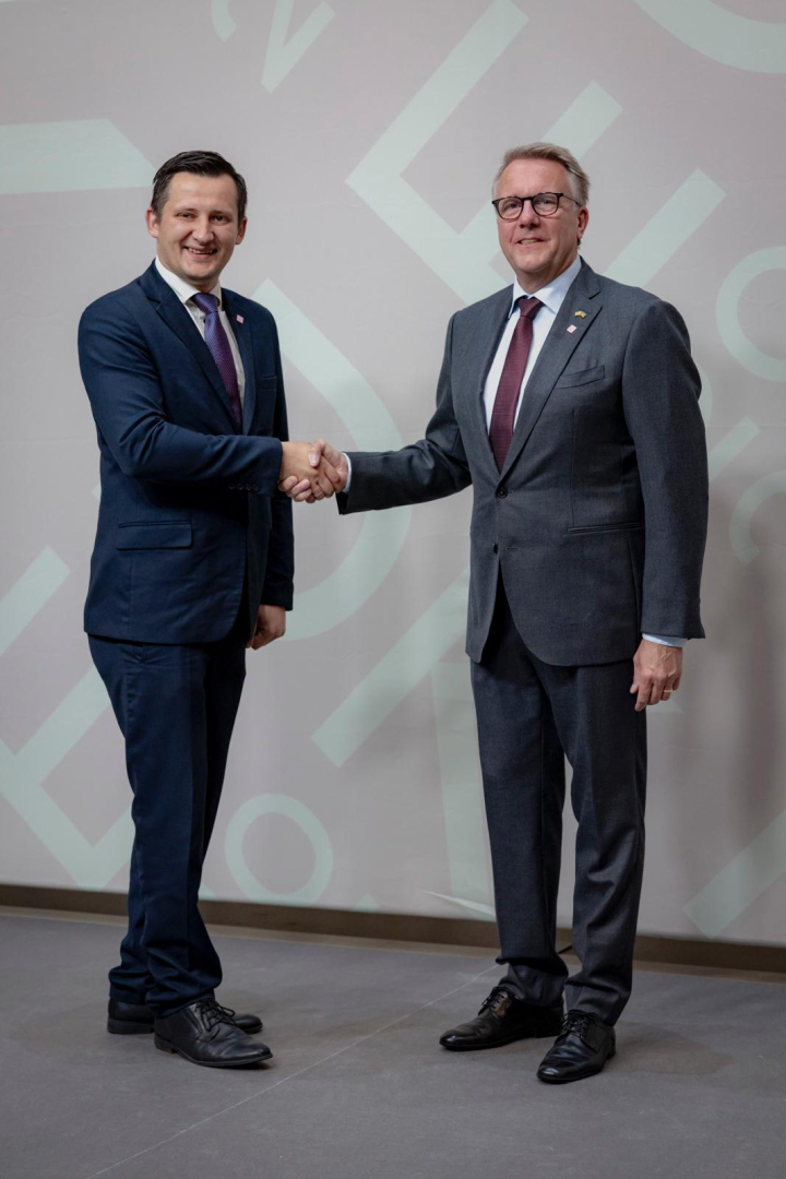EM parlamentārais sekretārs Jurģis Miezainis ar Dānijas industrijas, biznesa un finanšu lietu ministru Mortenu Bodskovu
