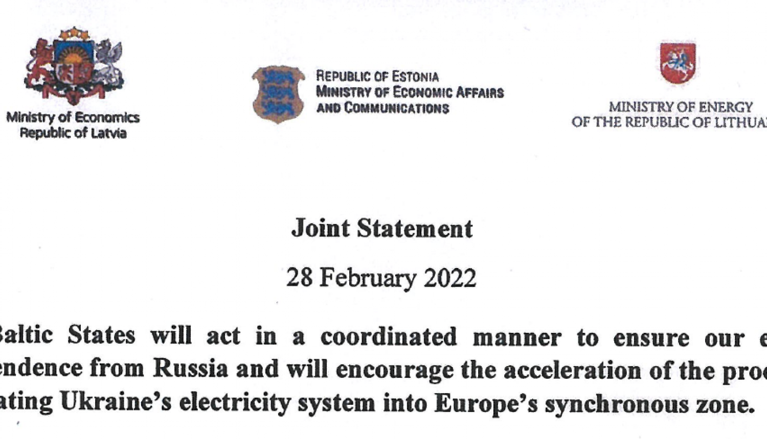Paziņojumā teikts, ka Baltijas valstis rīkosies koordinēti, lai nodrošinātu mūsu enerģētisko neatkarību no Krievijas energoresursu piegādēm, it īpaši gāzes, un rosinās paātrināt Ukrainas elektroenerģijas sistēmas integrēšanu kontinentālās Eiropas sinhronajā tīklā.
