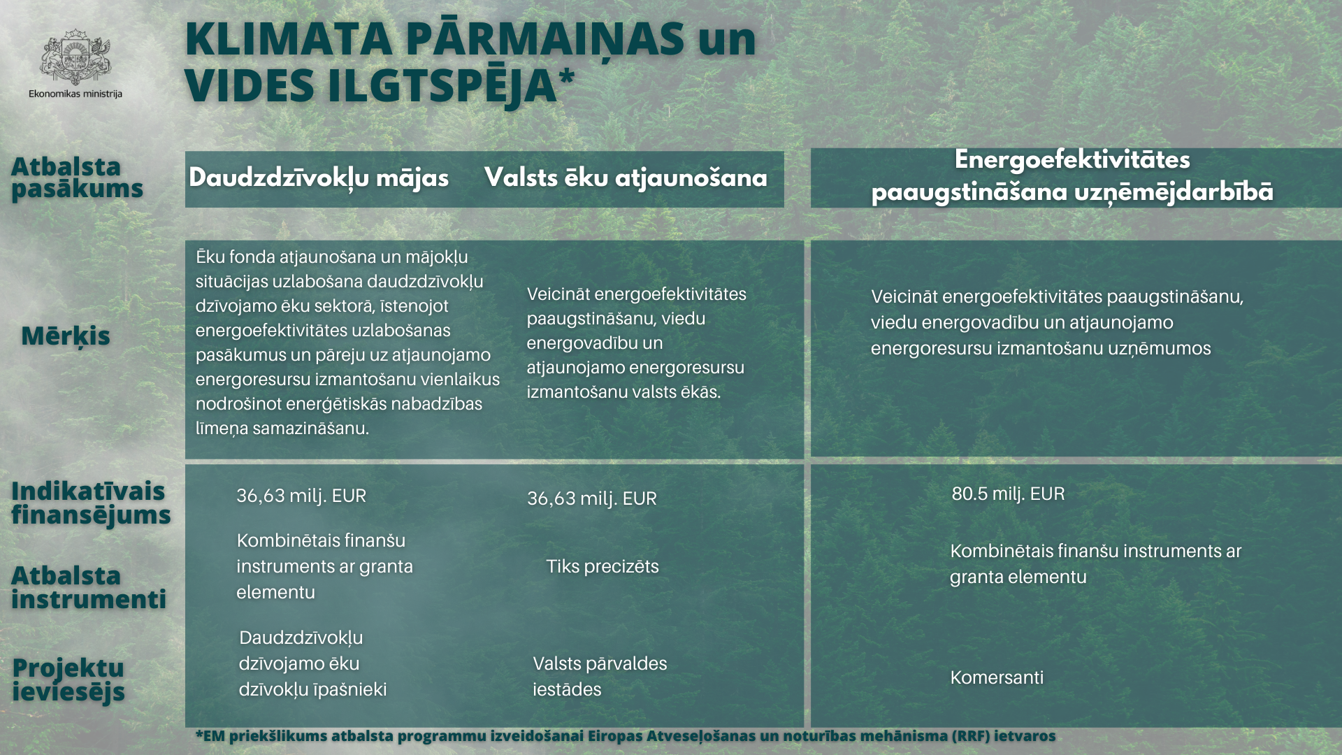 Šis ir viens no apjomīgākajiem pasākumu kopumiem, kur EM piedāvātajiem pasākumiem plānots novirzīt vairāk kā 150 milj. eiro. Tā ietvaros plānotas investīcijas daudzdzīvokļu māju energoefektivitātes uzlabošanai un pārejai uz atjaunojamo energoresursu tehnoloģiju izmantošanu; energoefektivitātes paaugstināšanai uzņēmējdarbībā, ietverot pāreju uz atjaunojamo energoresursu tehnoloģiju izmantošanu siltumapgādē un saistītās pētniecības un attīstības aktivitātēs, t.sk. bioekonomikā; kā arī energoefektivitātes uzlabošanai valsts sektora ēkās. Tāpat ir plānots īstenot reformas emisiju samazināšanai transporta sektorā, izveidojot biometāna izcelsmes apliecinājuma sistēmu.