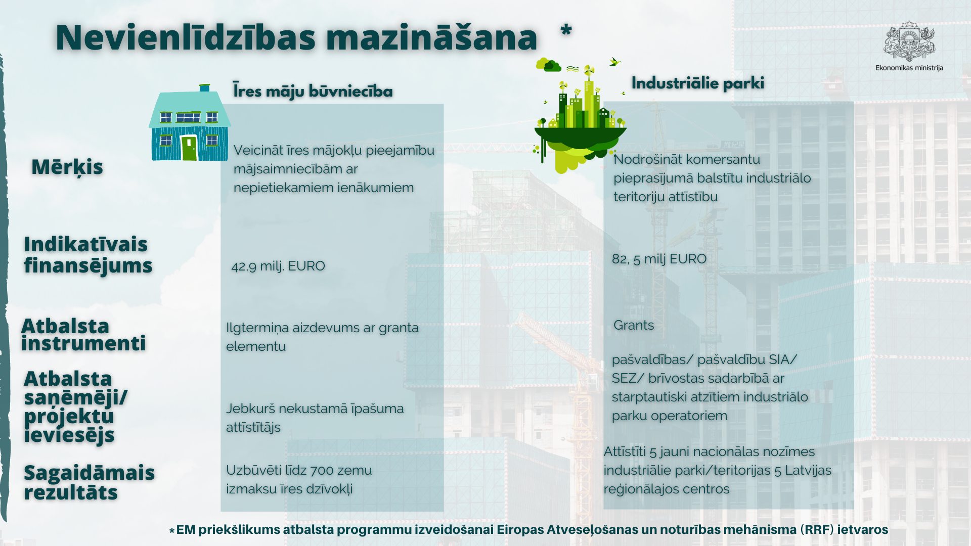 Ekonomikas ministrijas piedāvātais pasākumu kopums Eiropas Atveseļošanās un noturības mehānisma plānam 2021. – 2026. gadam Latvijas ātrākai atveseļošanai pēc Covid-19 izraisītās krīzes ietver četrus darbības virzienus – ekonomikas transformāciju un produktivitāti, reģionālās nevienlīdzības mazināšanu, uzņēmumu digitalizāciju un klimata pārmaiņas, uzņēmējdarbības atbalstam paredzot vismaz 400 miljonus eiro.