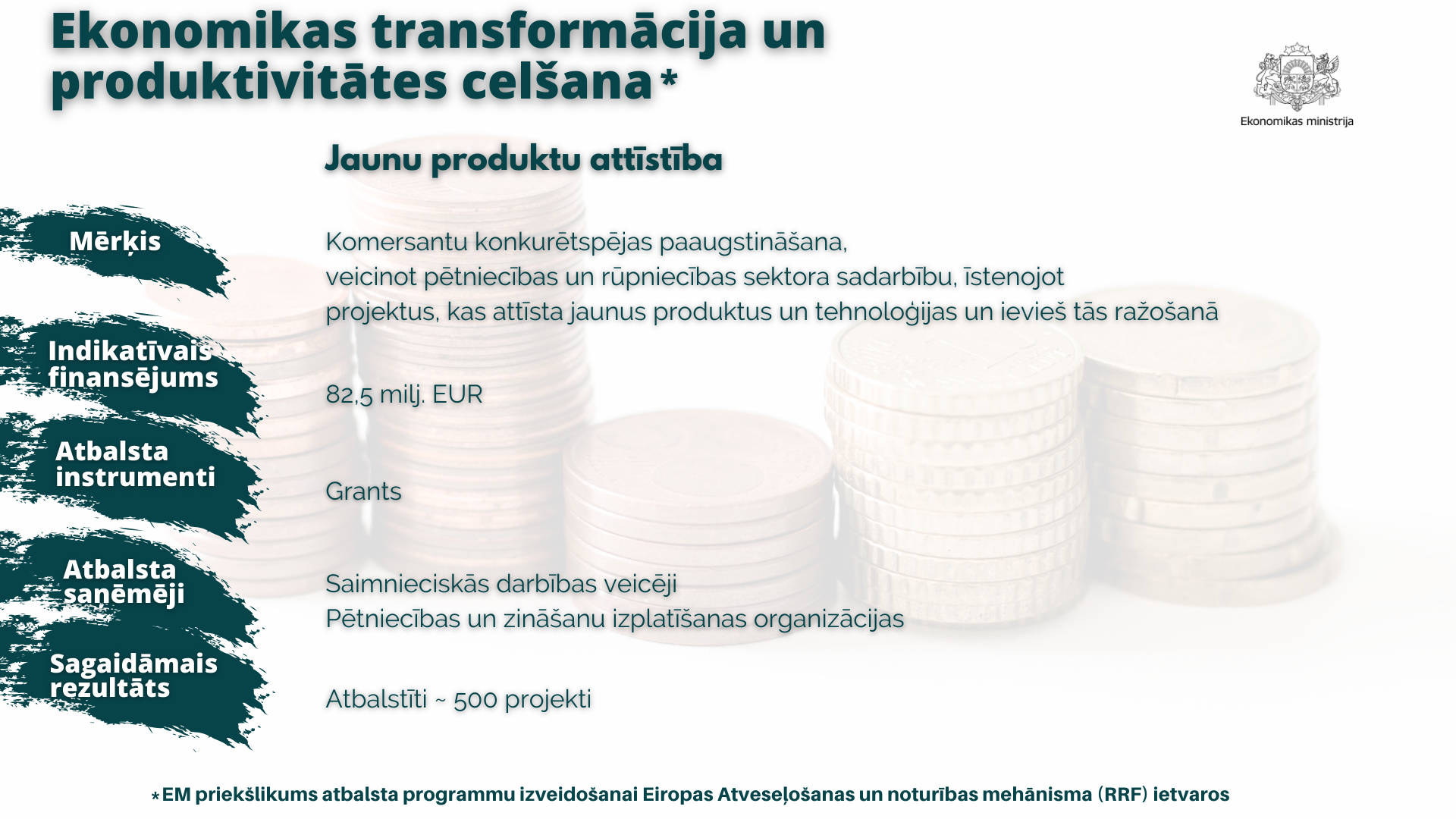 Lai pārvarētu Covid-19 radītās sekas, kā arī nodrošinātu Latvijas ekonomikas ilgtspējīgu attīstību, ir nepieciešams orientēties uz tautsaimniecības transformāciju uz augstāku pievienoto vērtību, produktivitāti un efektīvāku resursu izmantošanu. Tādēļ, komersantu konkurētspējas paaugstināšanai, veicinot pētniecības un rūpniecības sektora sadarbību, kā arī projektu īstenošanai, jaunu produktu un tehnoloģiju attīstībai un ieviešanai ražošanā, EM piedāvā ieviest granta atbalsta mehānismu, šim mērķim paredzot aptuveno finansējumu 82,5 milj. eiro apmērā. Atbalsta saņēmēji būtu uzņēmumi un pētnieciskās un zināšanu izplatīšanas organizācijas, īstenojot aptuveni 500 projektus.