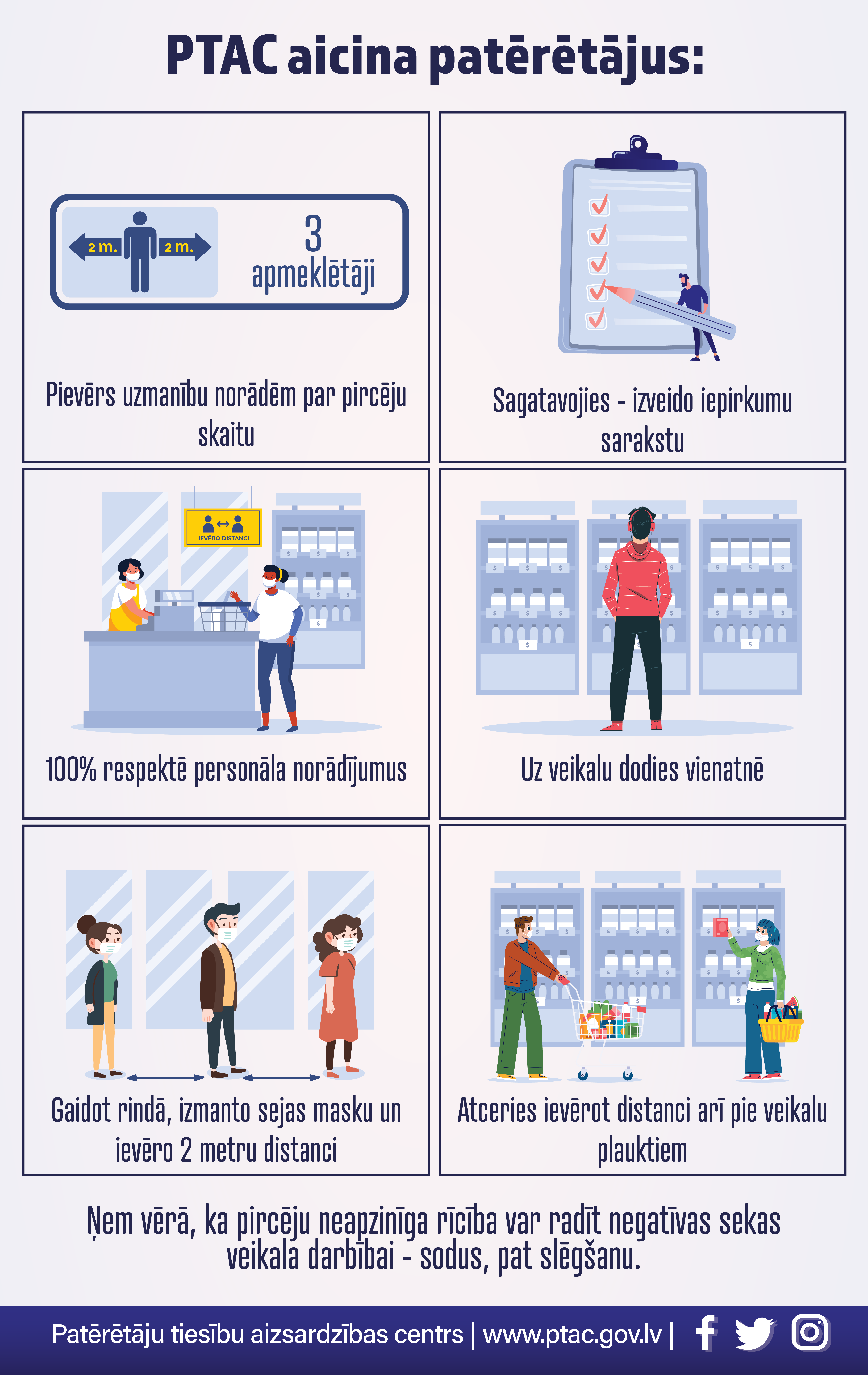 - Pievērst uzmanību norādēm par pircēju skaitu, kuri drīkst vienlaicīgi atrasties veikalā un respektēt tos pircējus, kuri jau gaida iekļūšanu tirdzniecības vietā;