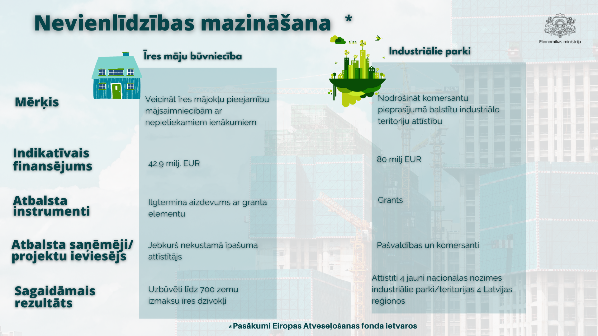Lai veicinātu mājokļu pieejamību iedzīvotājiem, kas nepietiekamu ienākumu dēļ nevar atļauties mūsdienu būvniecības standartiem un energoefektivitātes prasībām atbilstošu mājokli uz tirgus nosacījumiem, Ekonomikas ministrija plāno izveidot Finansēšanas fondu zemas īres mājokļu būvniecībai. Kopumā šim mērķim paredzēts finansējums 42,9 milj. eiro apmērā sniedzot ilgtermiņa aizdevumus ar granta elementu nekustamā īpašuma attīstītājiem zemu izmaksu īres mājokļu būvniecībai. Ar šo finansējumu iecerēts uzbūvēt vismaz 700 īres dzīvokļus.