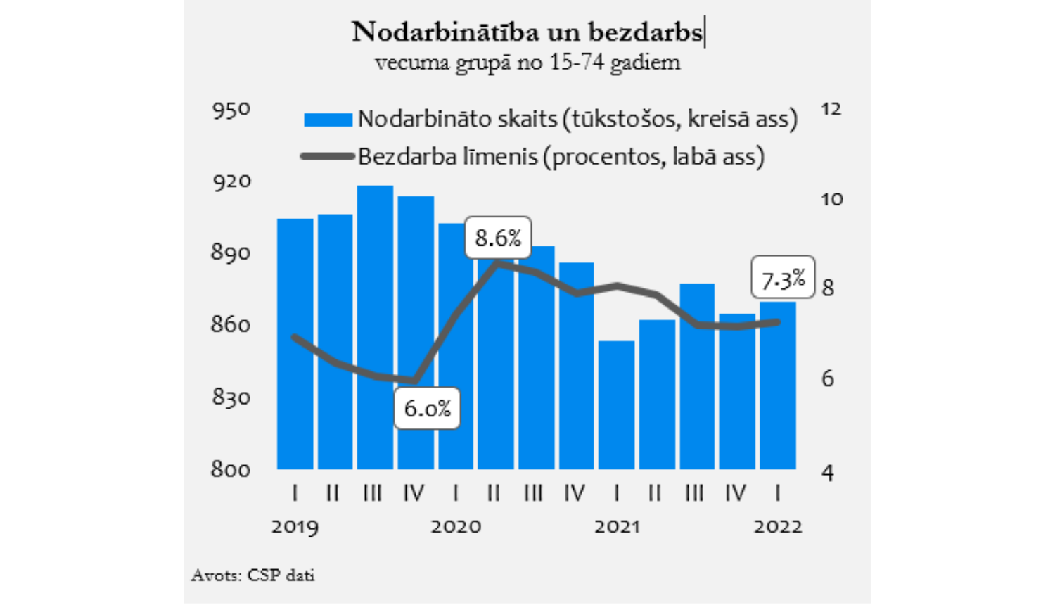 Kopš 2020. gada vidus saglabājās tendence samazināties bezdarba rādītājiem. Bezdarba līmenis 2022. gada 1. ceturksnī samazinājās līdz 7,3%, kas bija par 0,8 procentpunktiem mazāks rādītājs nekā attiecīgi 2021. gada 1. ceturksnī (8,1%). Kopumā š.g. 1. ceturksnī darba meklējumos bija 68 tūkstoši iedzīvotāji vecumā no 15-74 gadiem, kas ir par 9% (6,7 tūkstošiem) mazāk nekā 2021. gada 1. ceturksnī. Kopumā bezdarba līmenis Latvijā 1. ceturksnī saglabājās augstāks nekā Lietuvā (6,4%) un Igaunijā (5,5%).