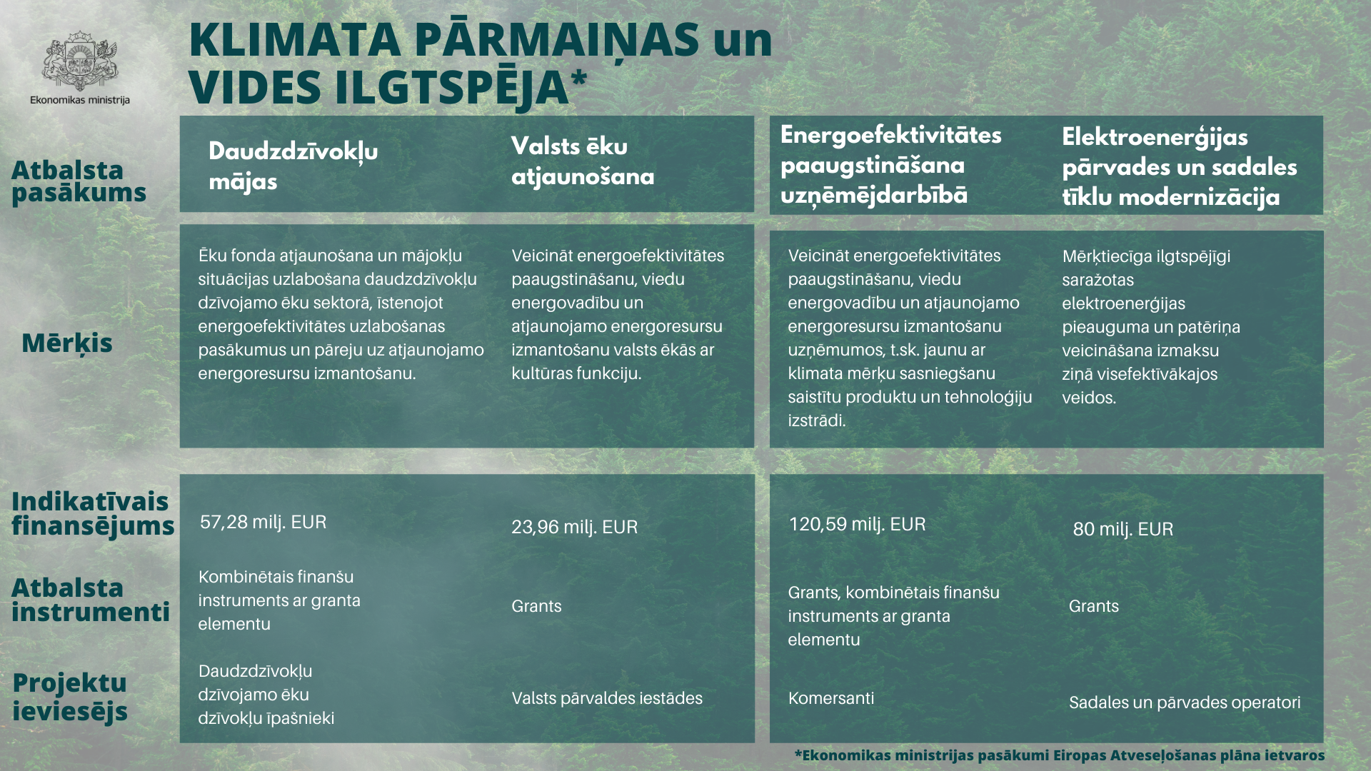 Ekonomikas ministrijas pārziņā ir atbalsta pasākumu izstrāde energoefektivitātes uzlabošanai ēku sektorā, uzņēmējdarbībā un elektroenerģijas pārvades un sadales tīklu modernizācijai. Šo pasākumu īstenošanai no AF plānots finansējums gandrīz 300 milj. eiro apmērā.