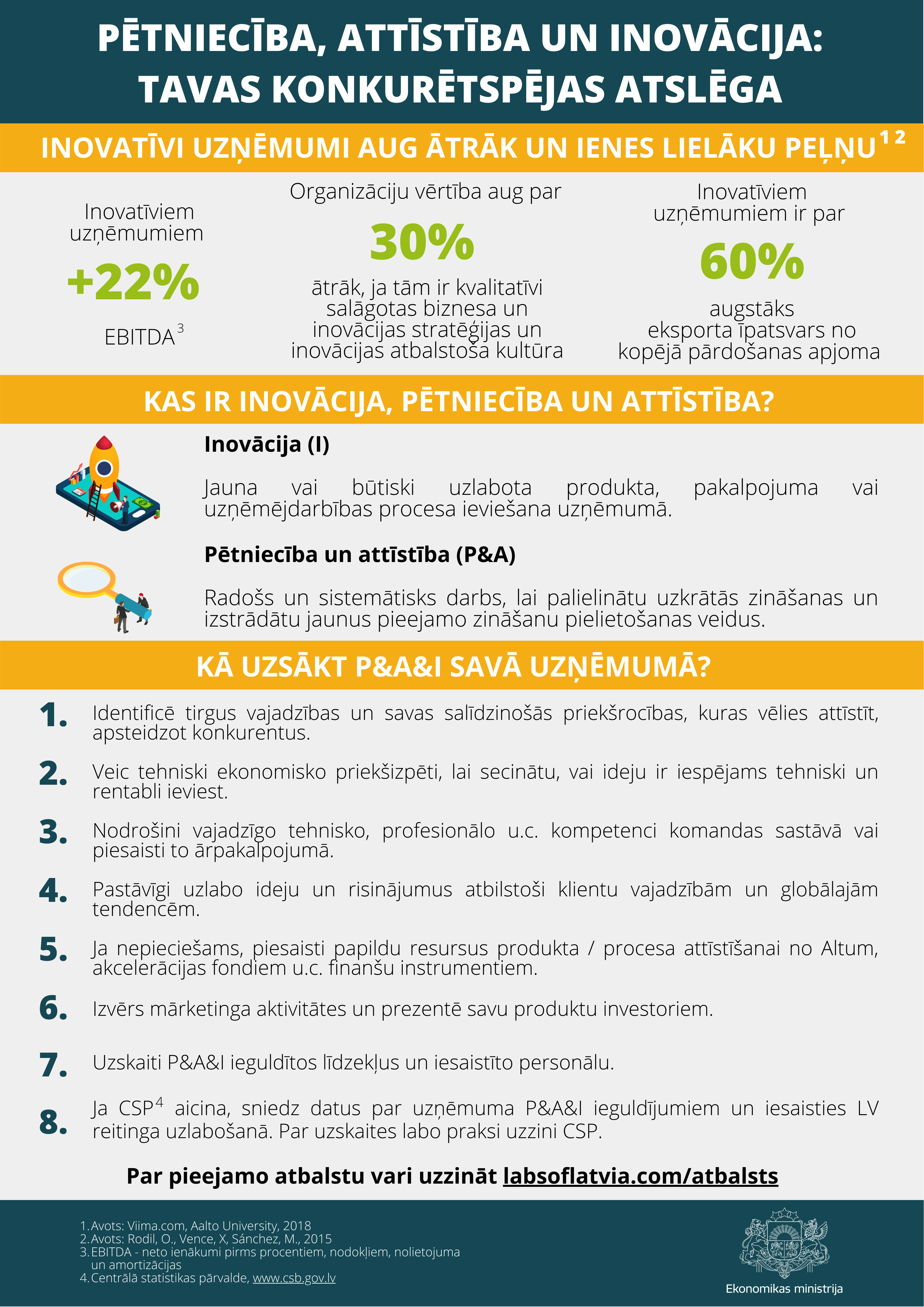 Latvijai zemākie rādītāji joprojām saglabājas privātajās investīcijās pētniecībā un attīstībā, mazajos un vidējos uzņēmumos, kas iekšēji veic inovācijas, un doktora grādu ieguvušo skaitā, tādēļ uzsvērta nozīmība turpināt un attīstīt pasākumus pētniecības, attīstības un inovācijas aktivitātes veicināšanai un līdz ar to šo rādītāju uzlabošanai.