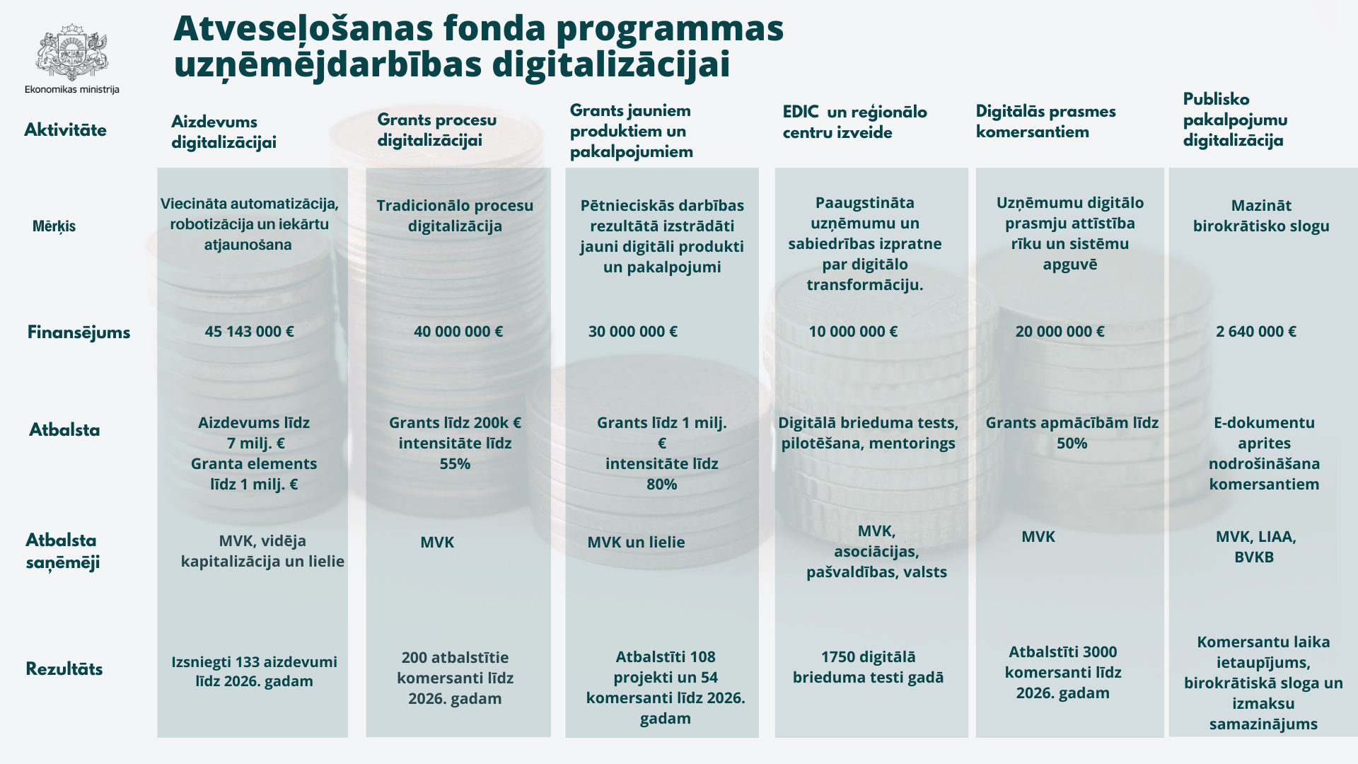 Ekonomikas ministrija ir uzsākusi darbu pie attiecīgo atbalsta programmu izstrādes un līdz 2026. gadam paredz sniegt atbalstu digitalizācijas veicināšanai sekojošiem pasākumiem: